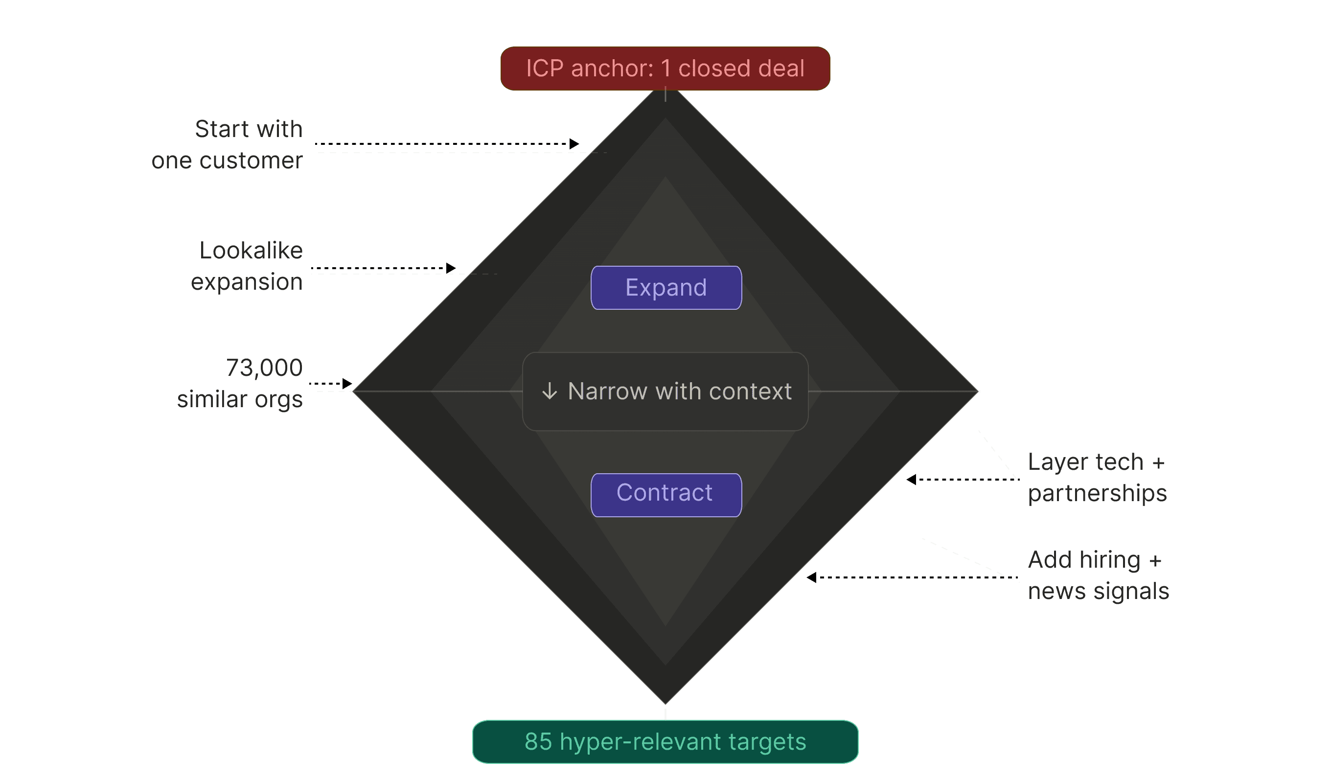 You might have heard of a bowtie funnel. We propose an alternative: the diamond funnel. You can explore and target your ICP using a diamond shape. In fact, you should be.