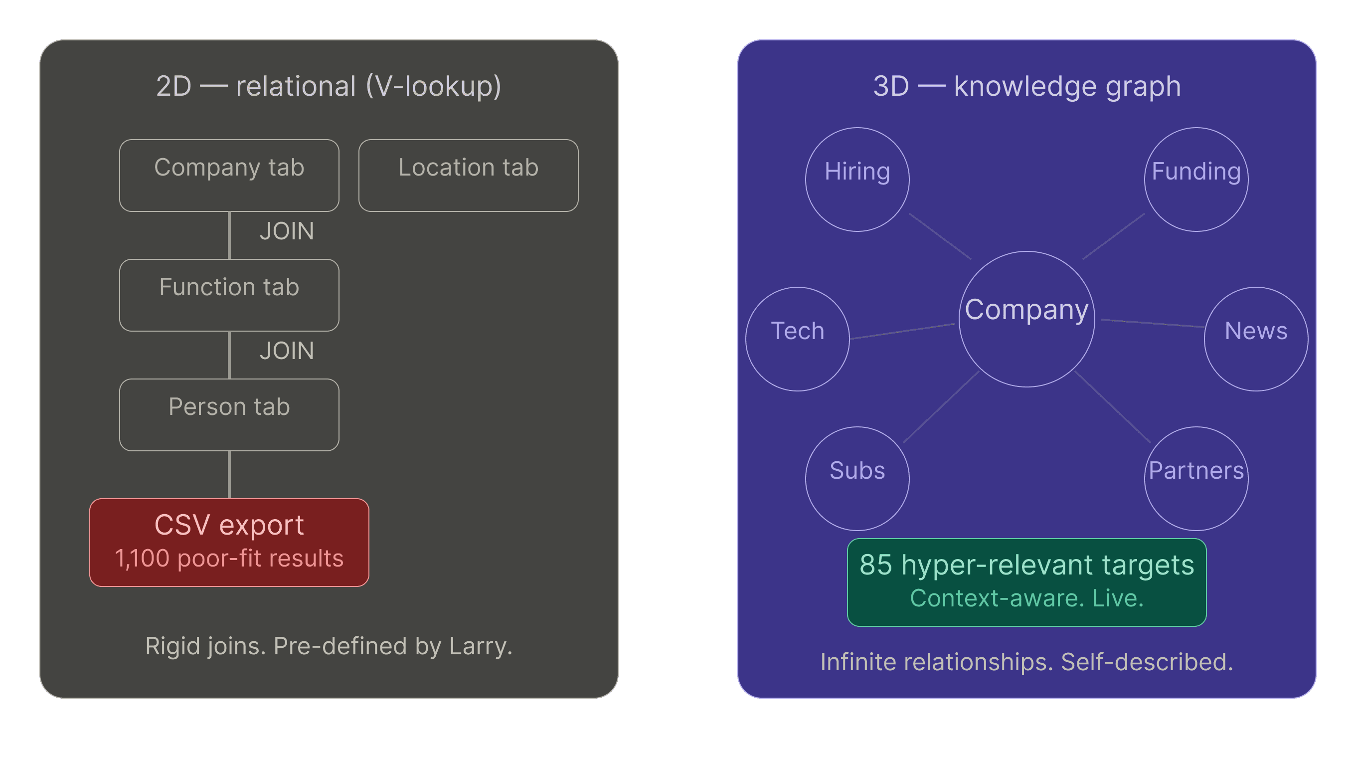 Your GTM motion needs data that thinks in dimensions, not columns. Stop embracing Larry. Stop doing V-lookups at scale. Your RevOps teams, your SDRs, your agents – hell, I’ll say even your prospects – all deserve better.