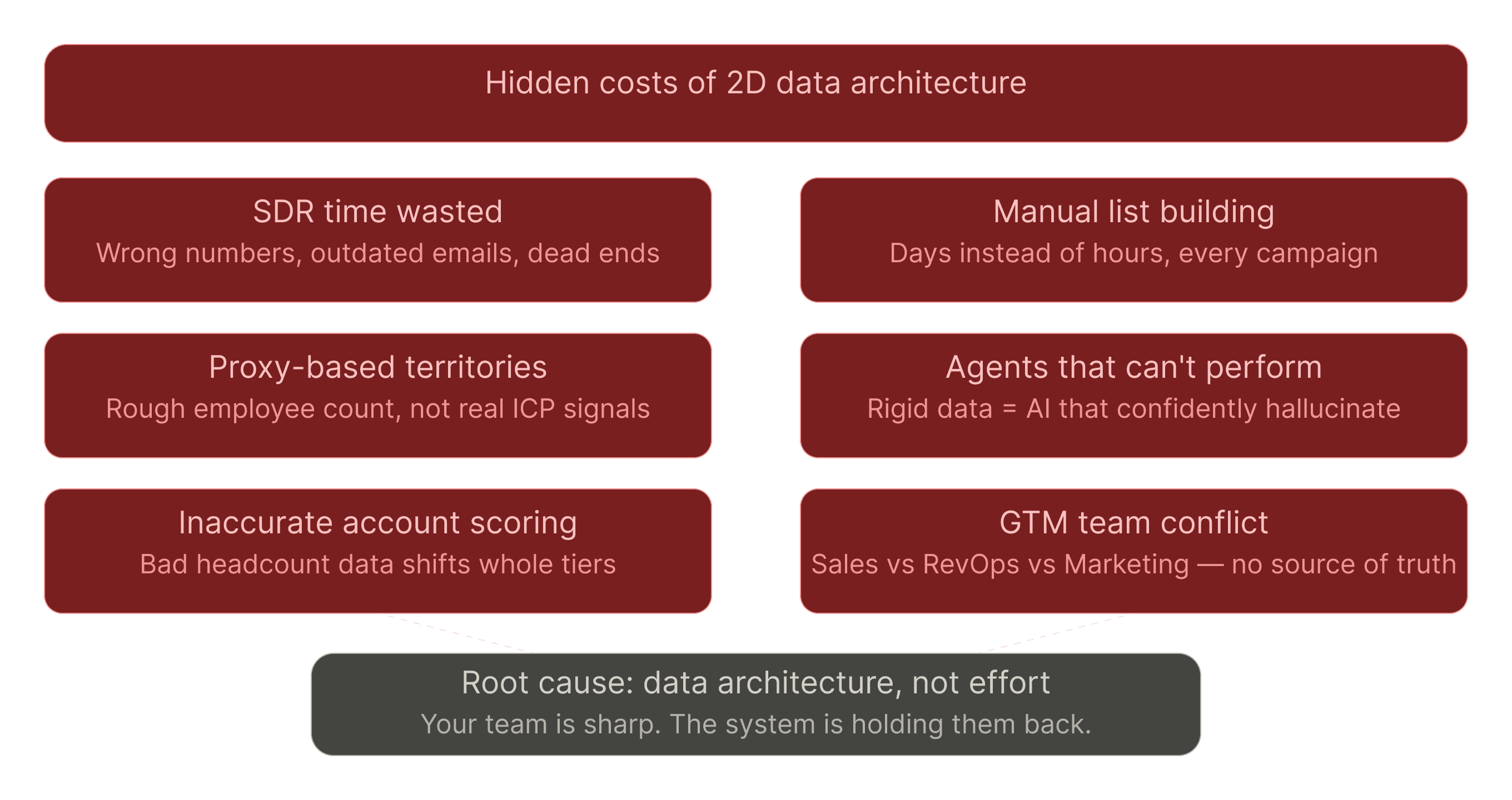 2D data architecture (defined here as data that is built on rigid rows, columns, and joins) does not support context. Flat data limits RevOps’ ability to define, in an exact way, what your ICP is at that moment. Your ICP isn’t flat, so why define your ICP on flat, point-in-time data?