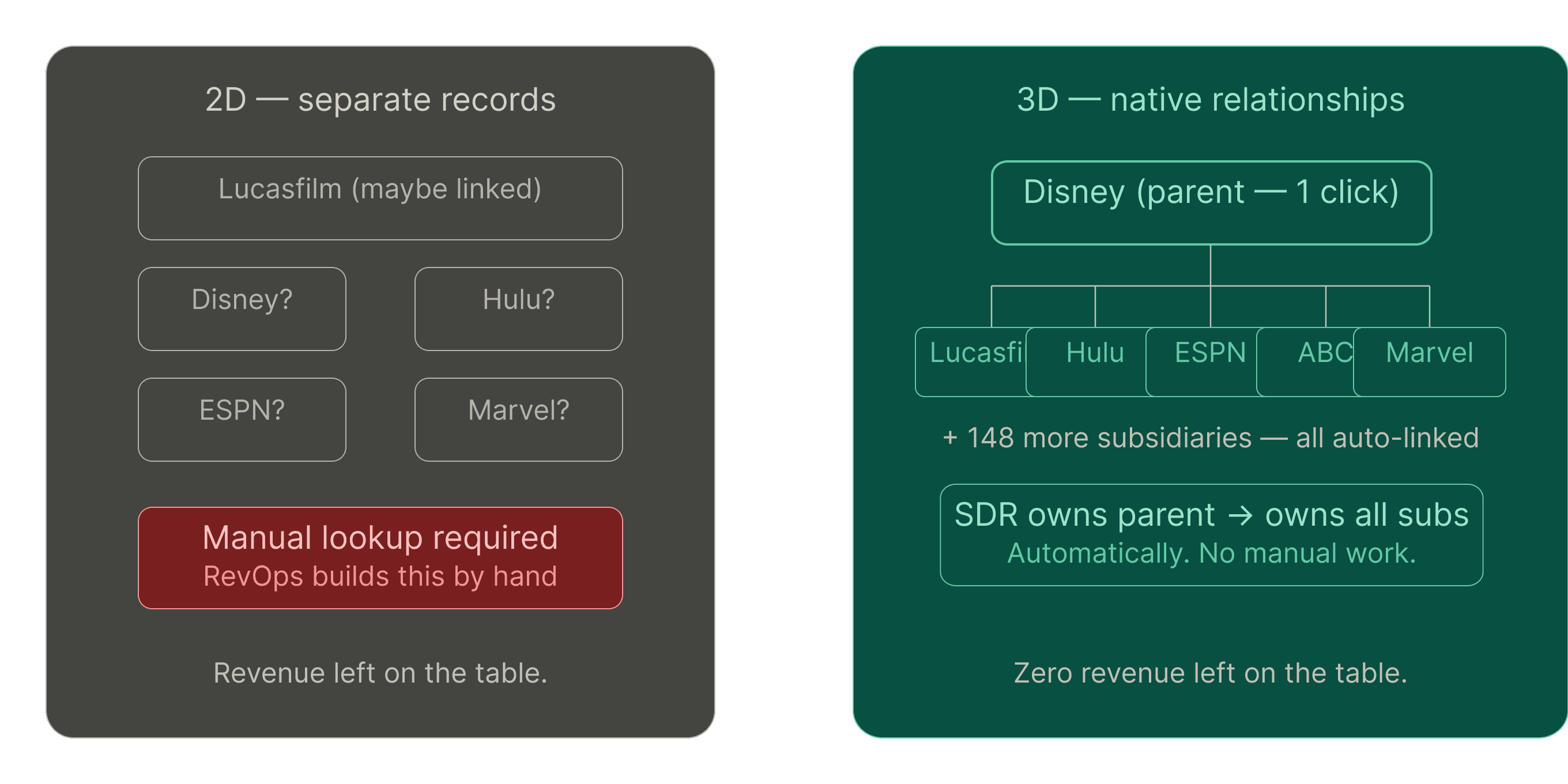 With 2D data, those are separate records. Maybe they're linked. Probably not. If they are, your RevOps team has manually built and corrected that list, then used what they hope is accurate data for account, territory planning, and nurture campaigns.