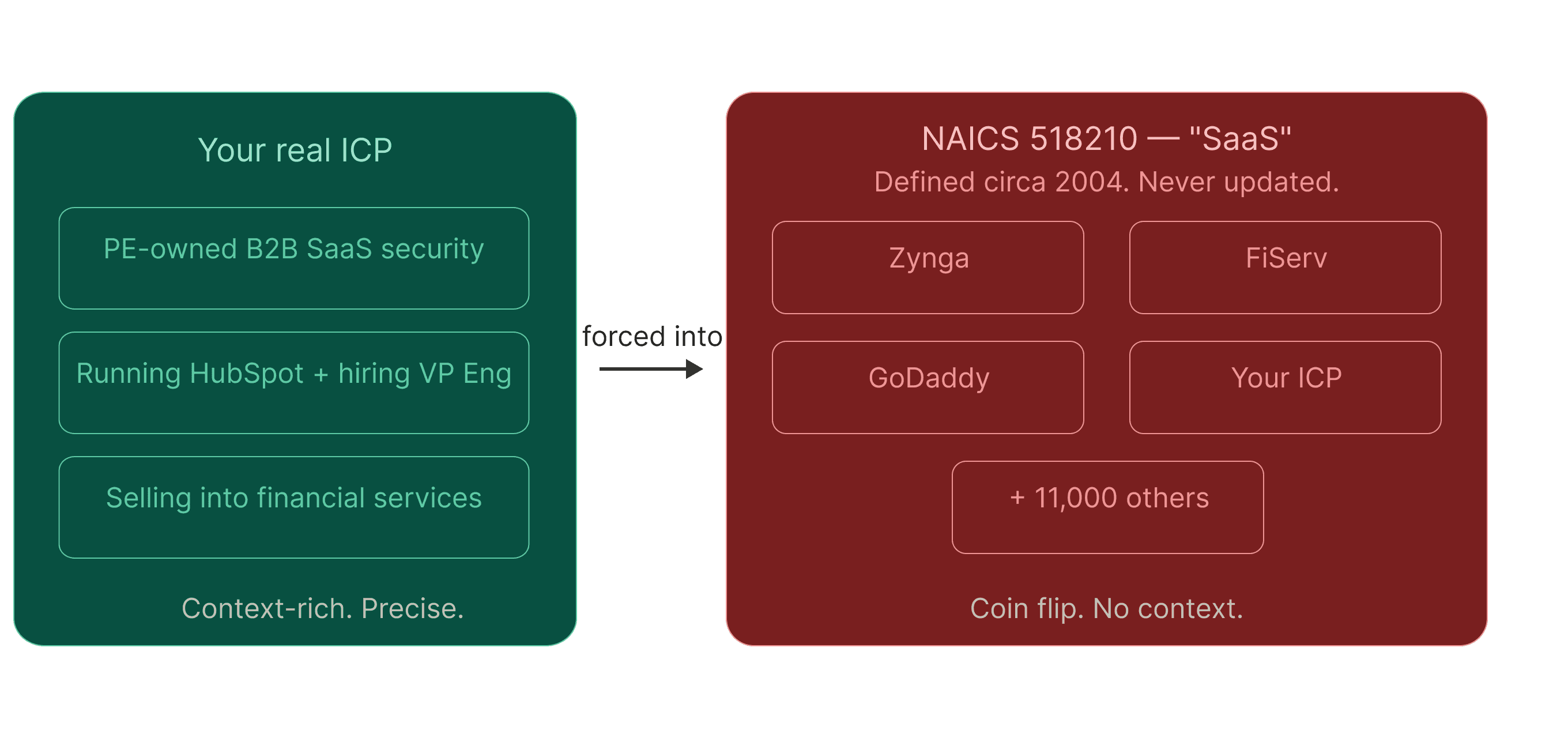 That's the “NAICS Code Tax”, hereby defined as “the hidden, huge cost of letting other people define your ICP.”. You're paying for precision, but you’re getting a coin flip.